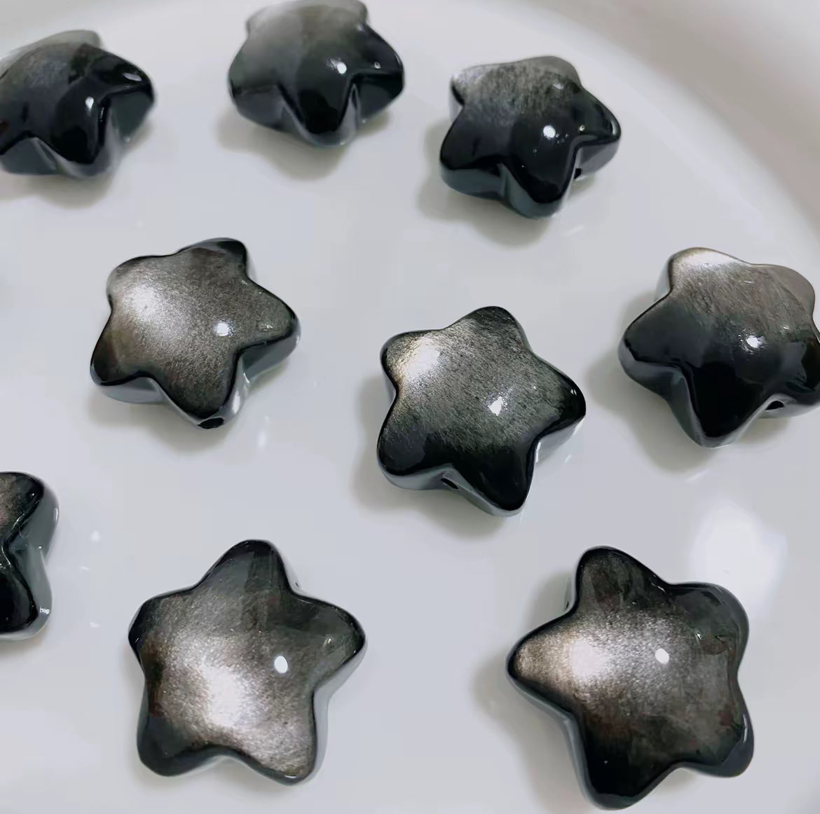 Like a night sky captured in stone, these black obsidian stars shimmer with silvery sheen and grounding energy. Perfect as protective talismans or statement accents in your crystal collection.