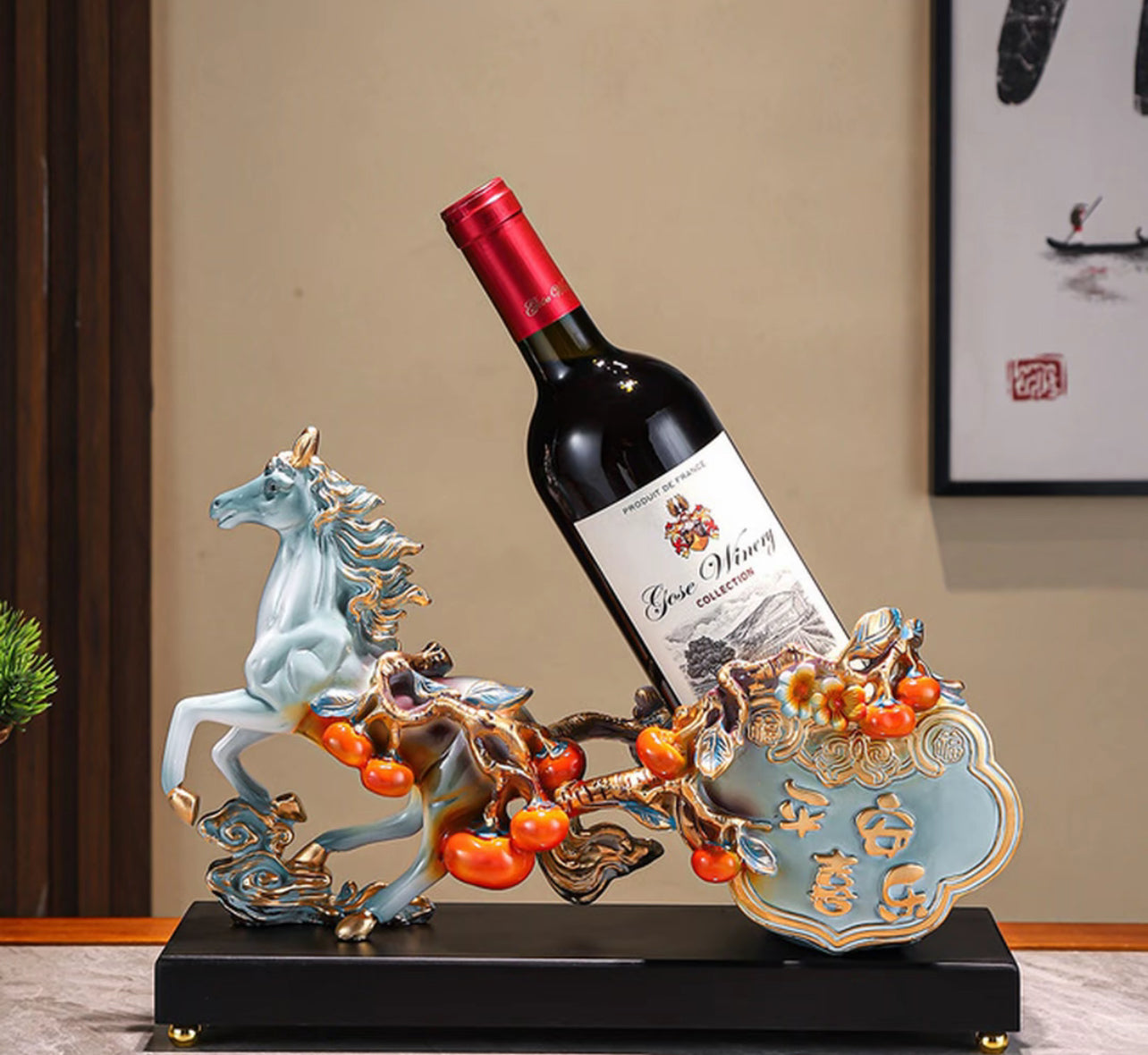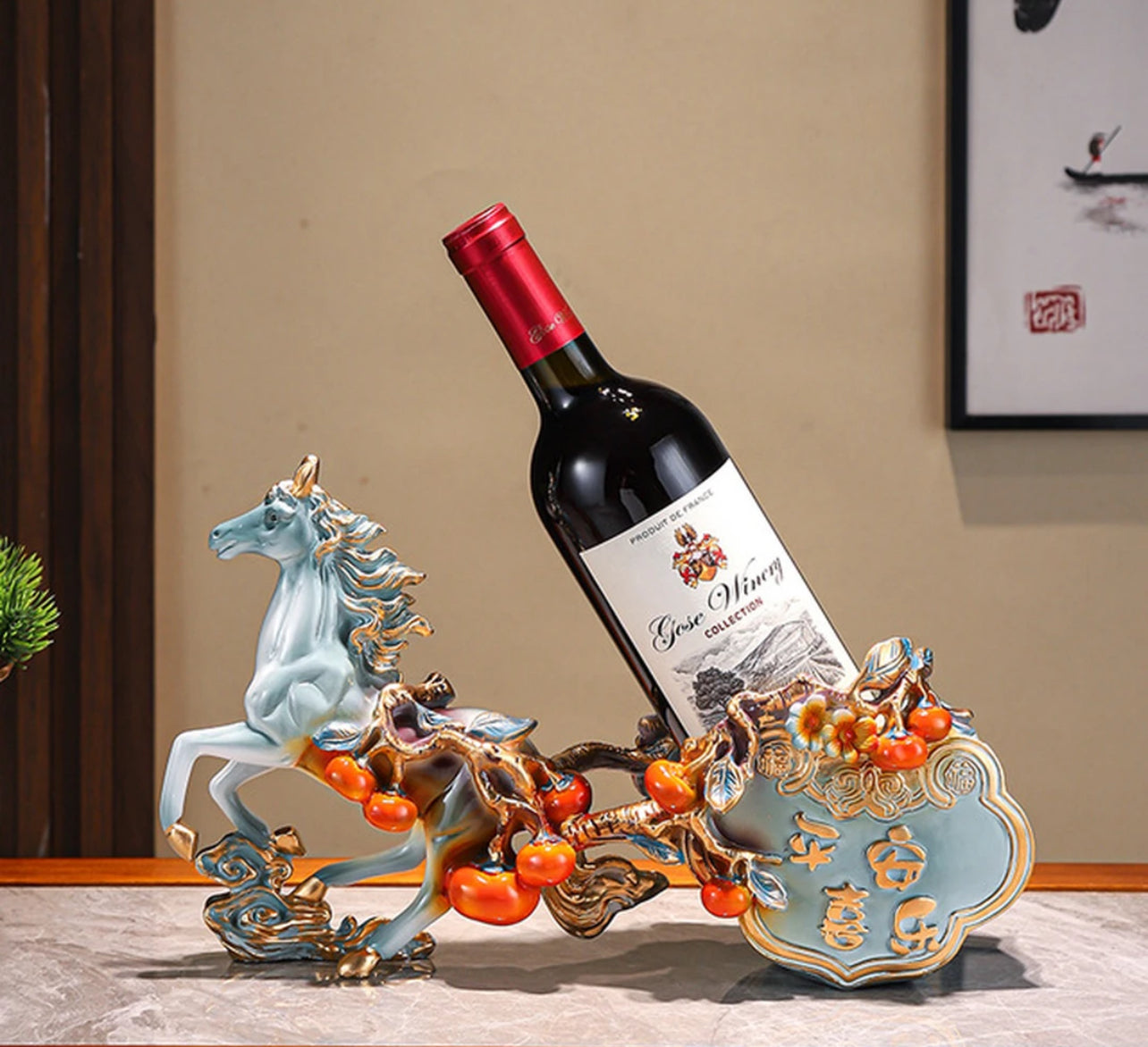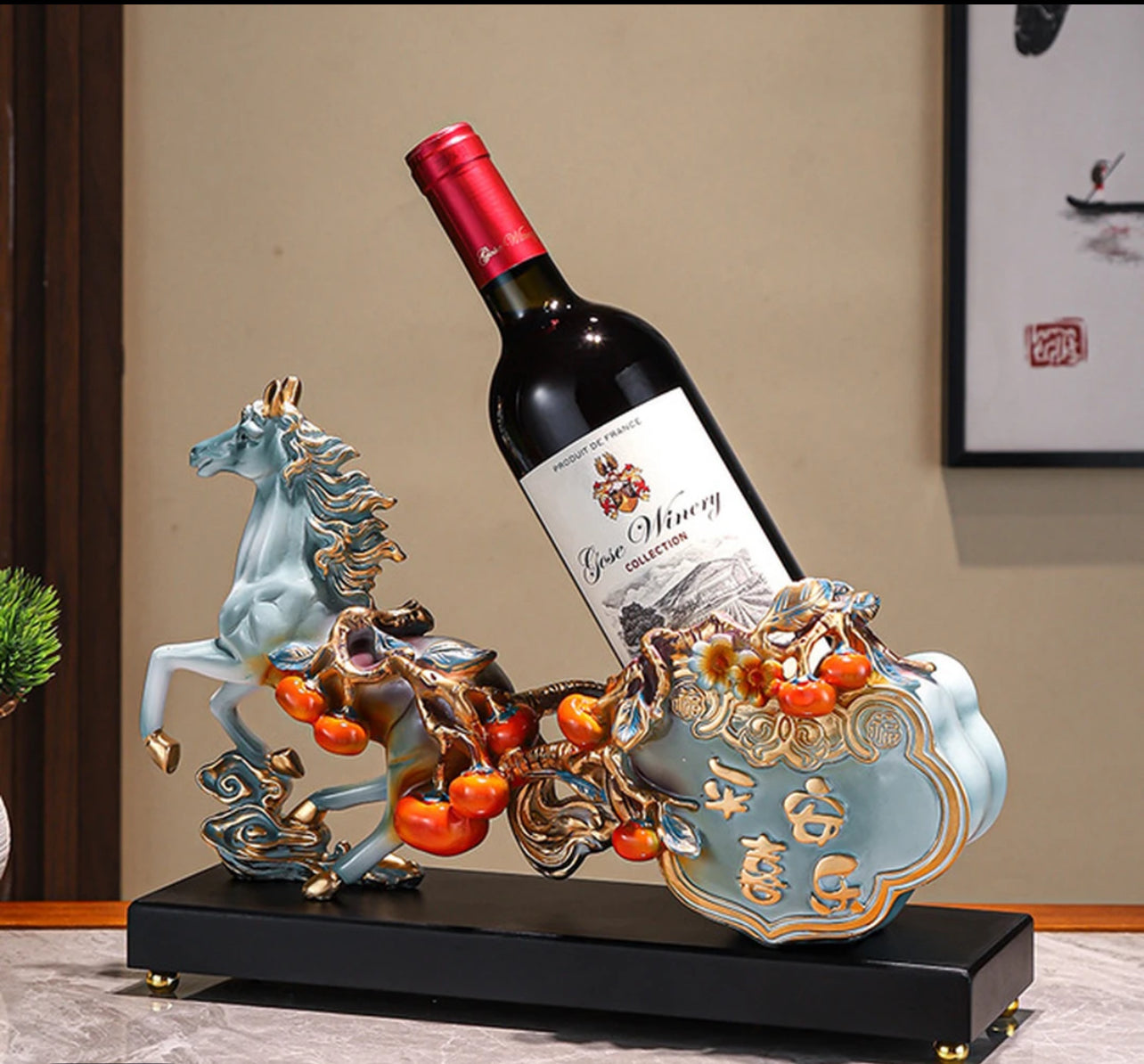A harmonious blend of elegance and symbolism, the piece also incorporates a Chinese plaque with golden calligraphy, anchoring the composition with wishes for prosperity and happiness. Perfect as a centerpiece, housewarming gift, or collector’s display, this fine art creation not only holds your wine — it holds a story of blessings galloping into your life.