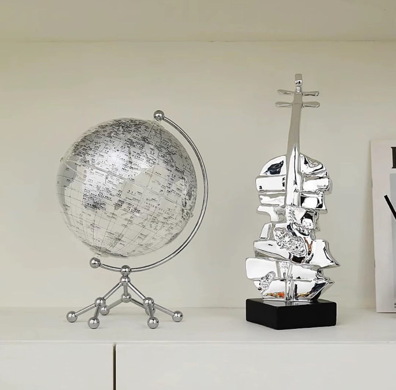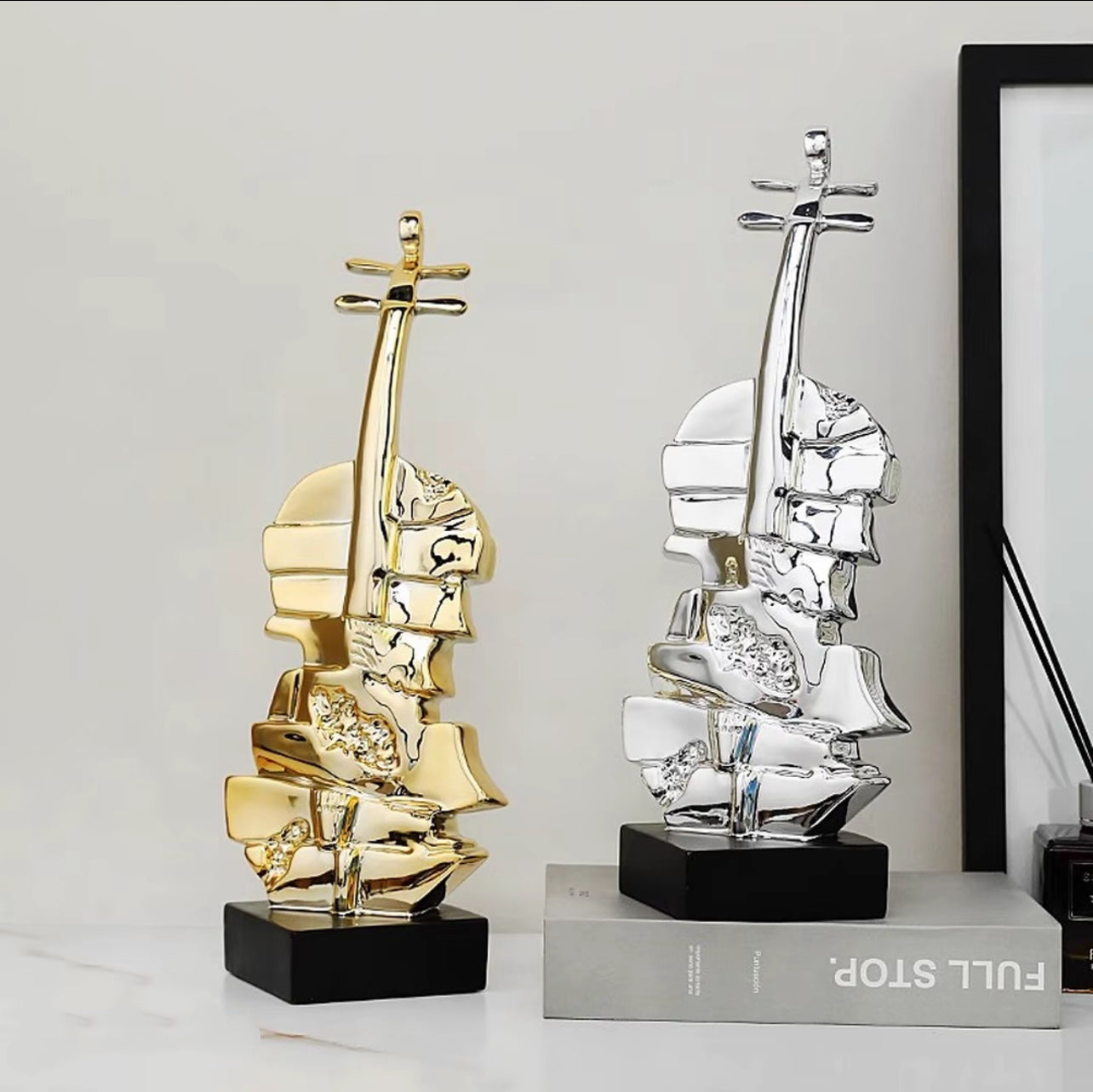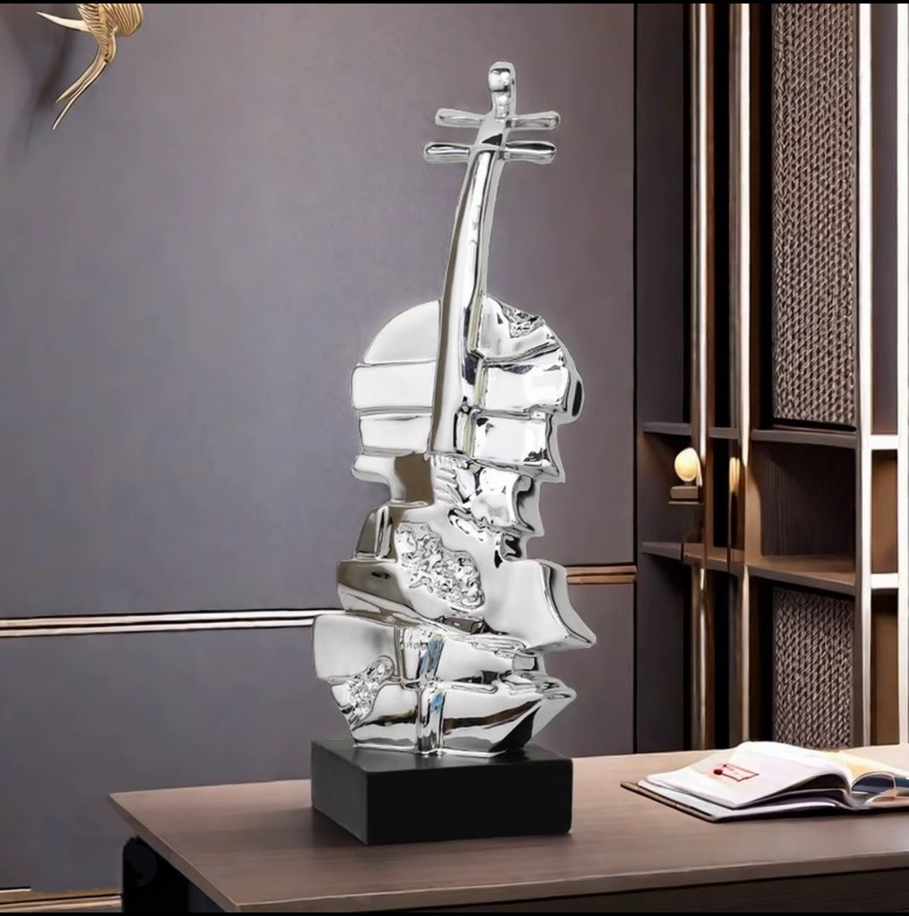 An avant-garde tribute to classical music, Echo of a Violin captures the soul of a violin in fluid, metallic form. This abstract sculpture features fragmented silver contours rising into the iconic silhouette of a string instrument, mounted on a sleek black base for contrast. Whether you’re a music lover or a design enthusiast, this modern piece brings harmony, creativity, and sophistication into any space.