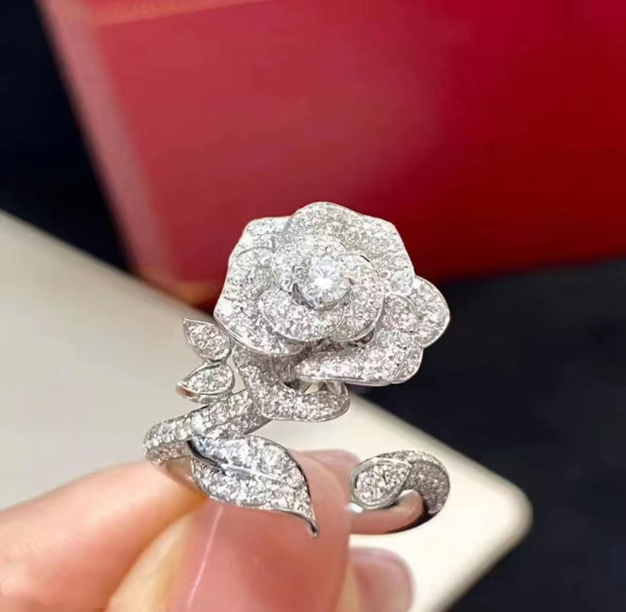 The Eternal Bloom Ring is a radiant celebration of timeless love and luminous grace. Crafted in the form of a blooming rose, this exquisite statement piece is encrusted with meticulously set clear crystals that shimmer from every angle. The petals unfold in delicate layers, capturing the full bloom of a rose at its peak — a symbol of enduring romance, beauty, and strength.