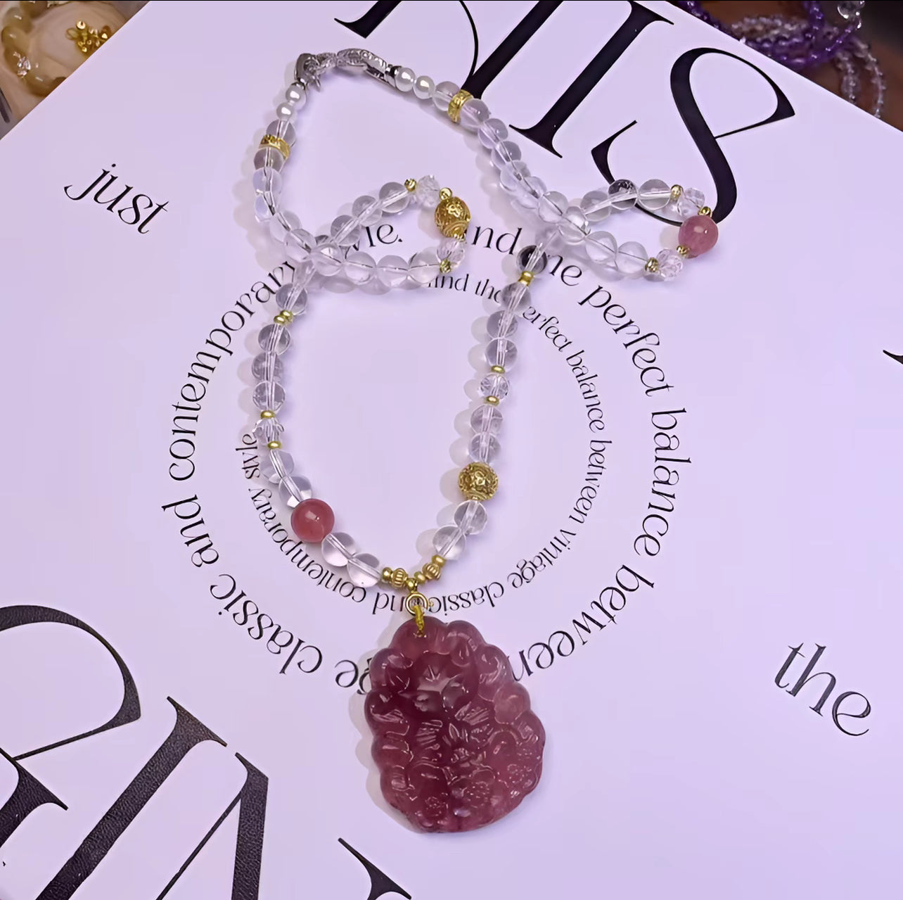 Adorn yourself with timeless elegance and ancient symbolism with our Fortune Blossom Amulet. This handcrafted piece features a delicately carved deep rose-red Pixiu pendant—an auspicious creature in Chinese culture believed to attract wealth, ward off evil spirits, and bring good luck to its wearer.
