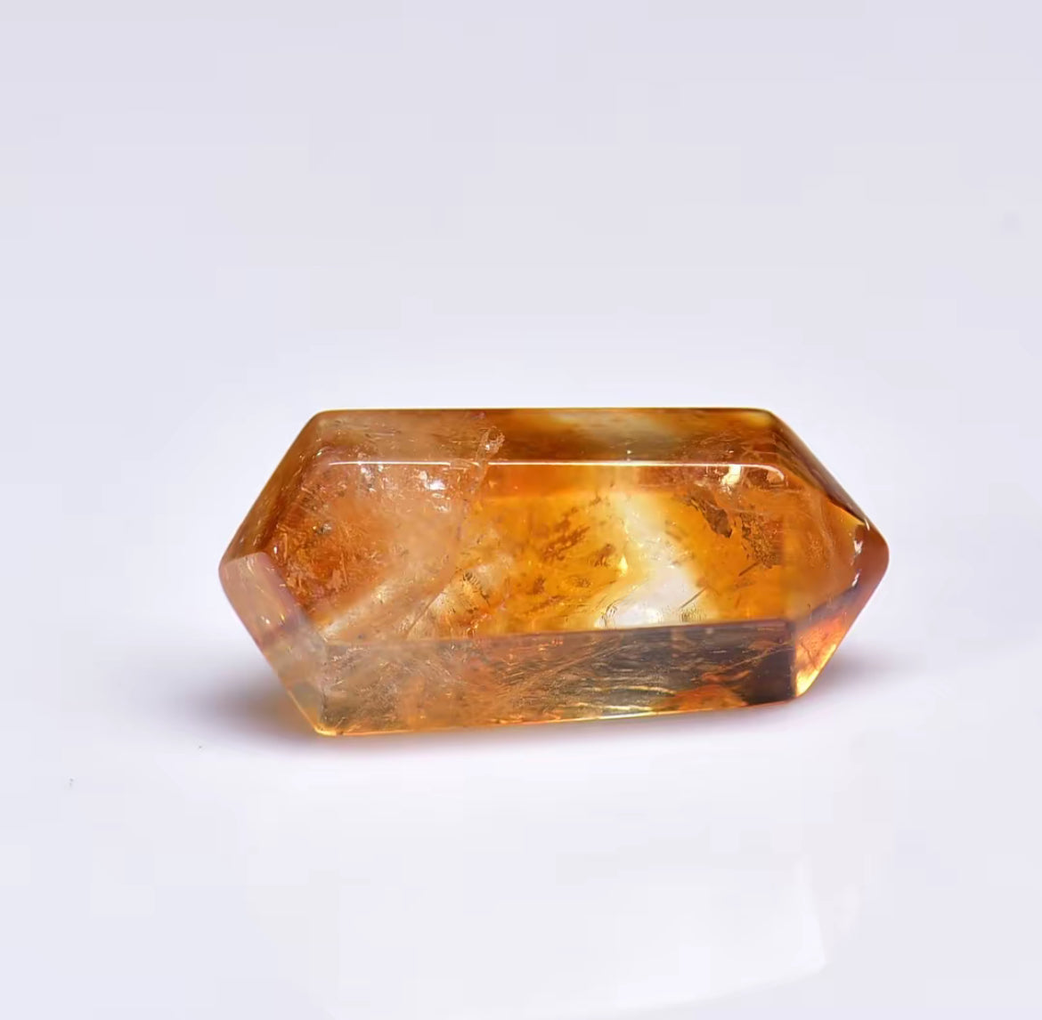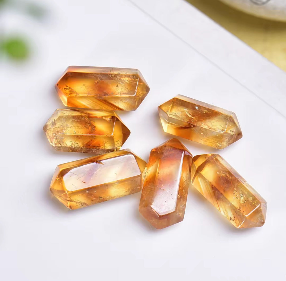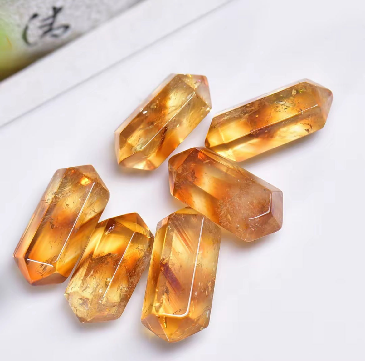 These radiant hexagonal points are crafted from natural citrine, glowing with warm honey tones and rich inner texture. Known as the “stone of abundance,” citrine is believed to attract prosperity, confidence, and clear thinking. Perfect as energy tools, jewelry components, or simply as sunlit companions on your desk.