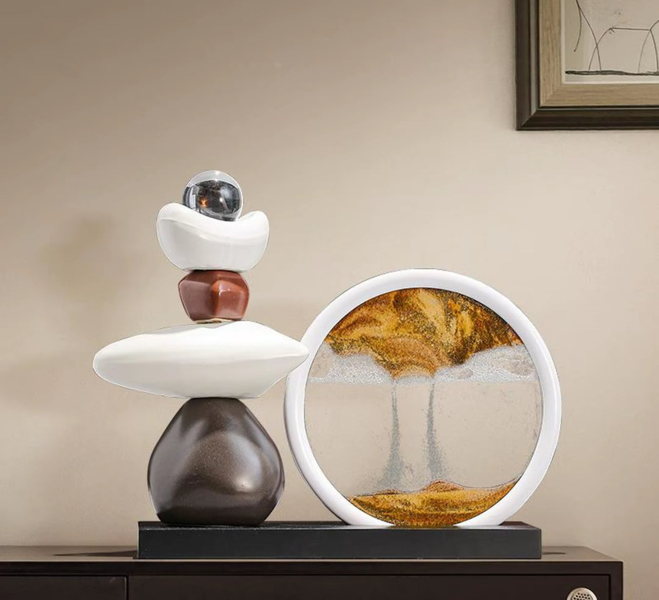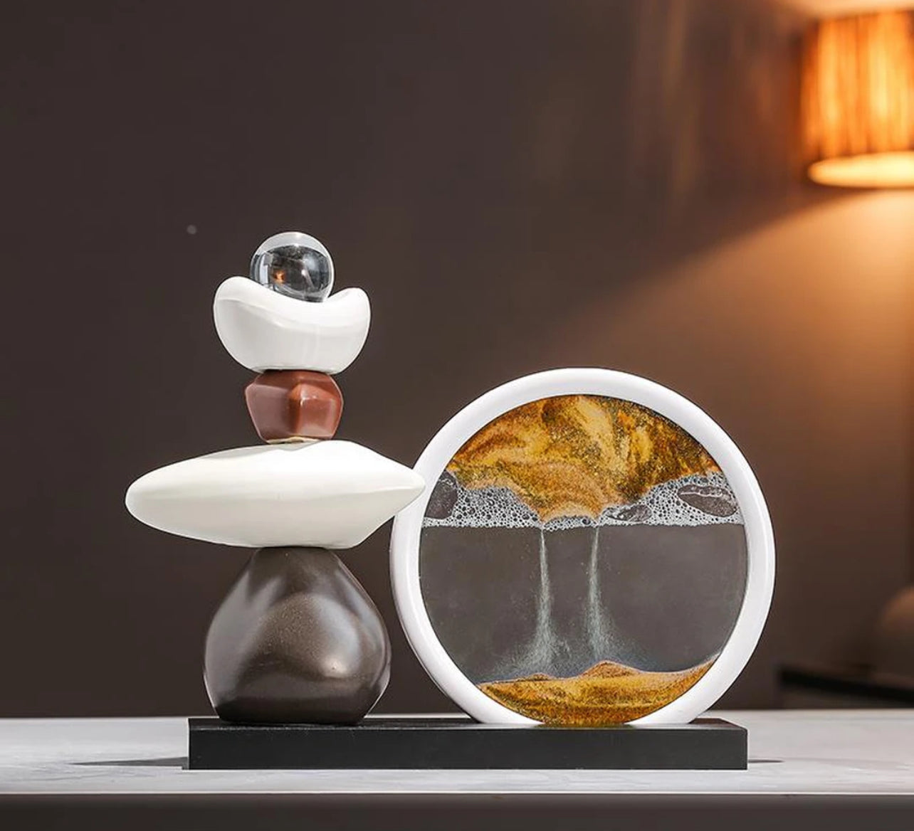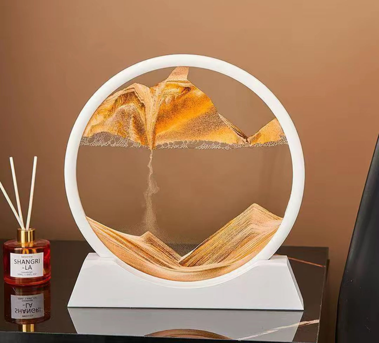 “Golden Dunes of Time” is a mesmerizing kinetic sand art sculpture that captures the eternal dance between motion and stillness. Within a luminous white circular frame, shimmering golden sand flows gracefully to create ever-shifting desert landscapes — mountains rise and valleys fall with each turn, offering a unique scene every time. Inspired by nature’s silent transformations and the passage of time, this piece evokes a meditative calm and philosophical depth. Perfect for desktops, shelves, or modern zen spaces, it reminds us that beauty is constantly being shaped — just like life itself.