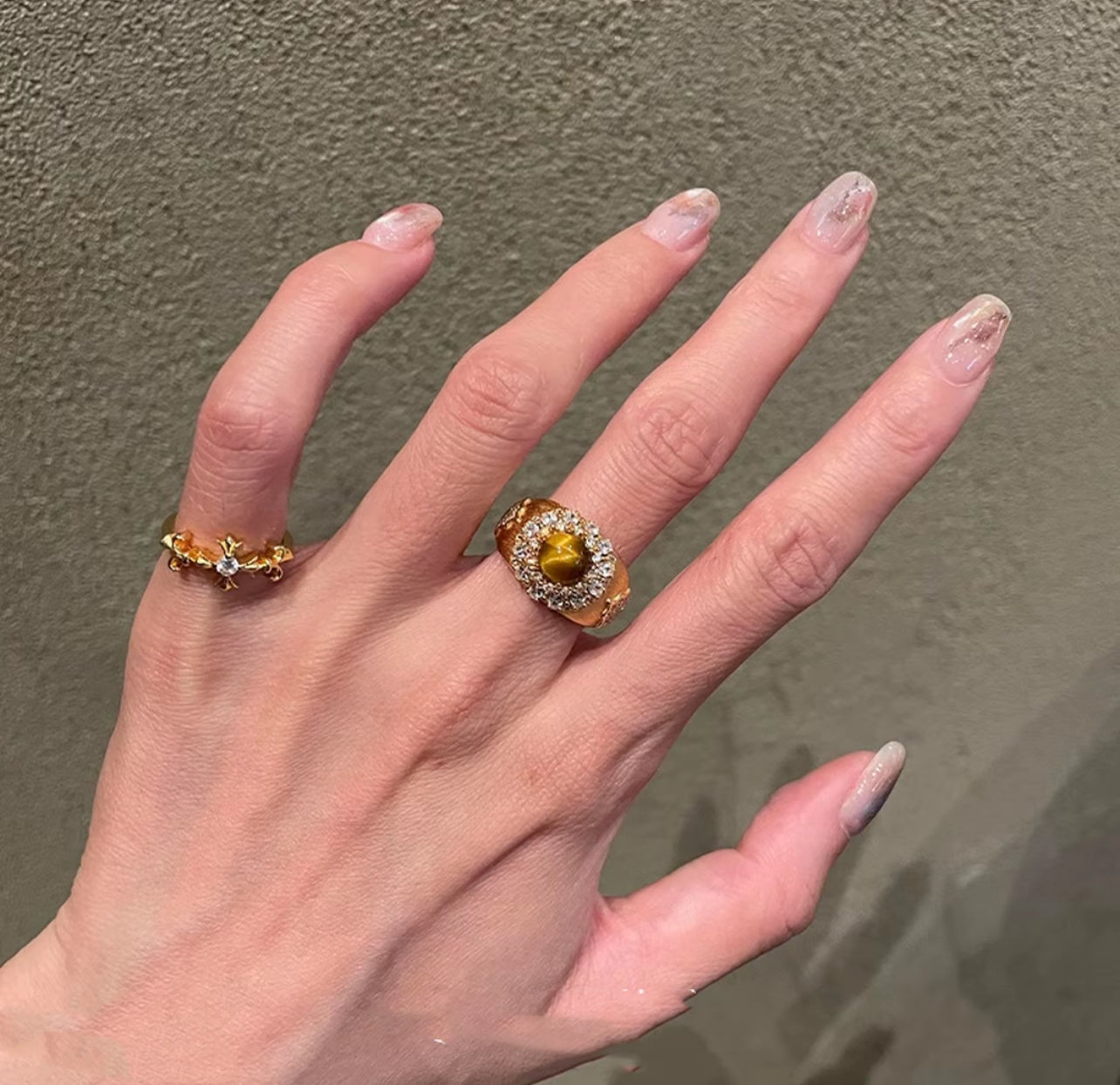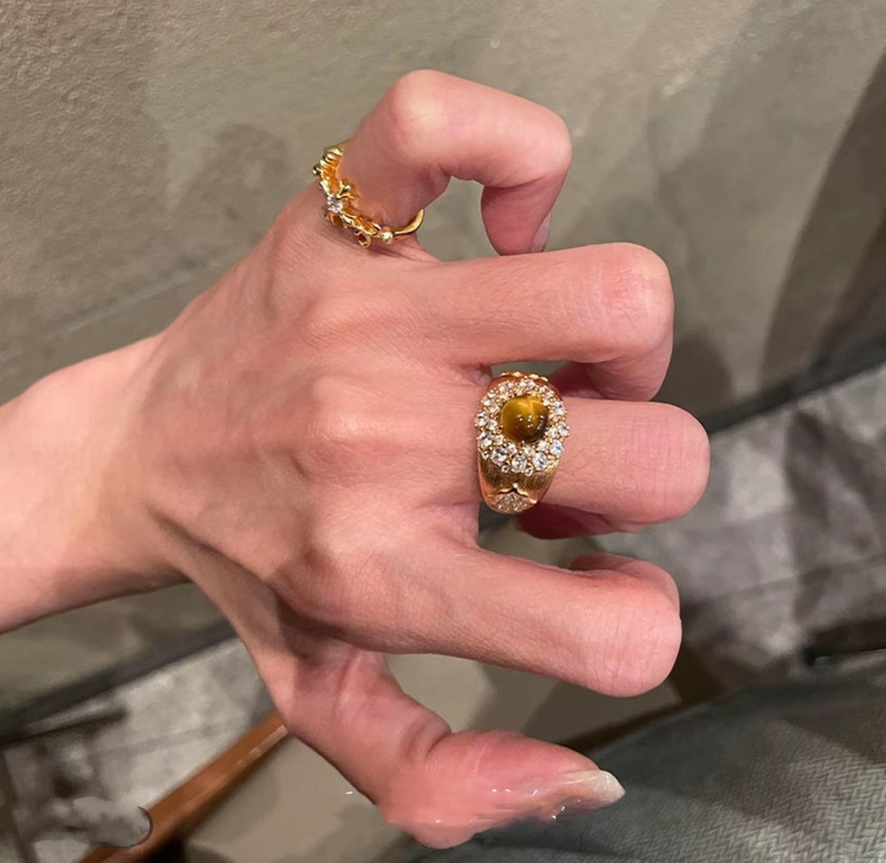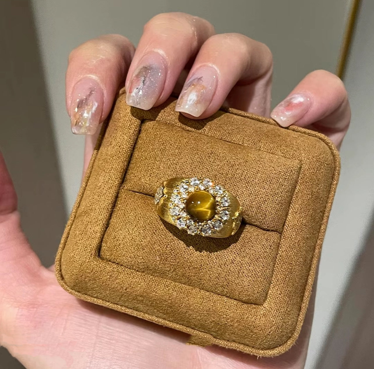 Channeling the majestic energy of the sun, this radiant statement ring features a luminous golden cat’s eye stone at its heart, surrounded by a halo of brilliant white crystals. The oval-shaped center stone captures and reflects light with a captivating chatoyancy, giving the illusion of a glowing slit—like the eye of a wild feline. Set in an opulent gold-tone band with an organic, sculpted finish, this piece is a bold yet elegant tribute to intuition, confidence, and inner strength. Ideal for those who embody fierce grace and magnetic allure, the Golden Eye of the Sun is a powerful talisman for your hand.