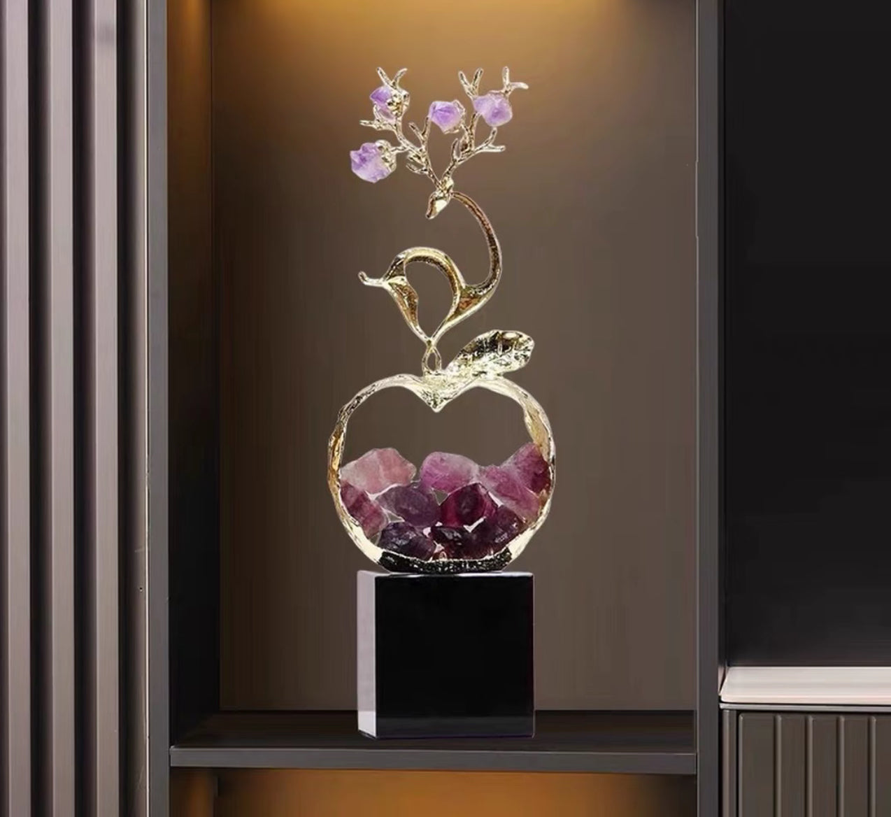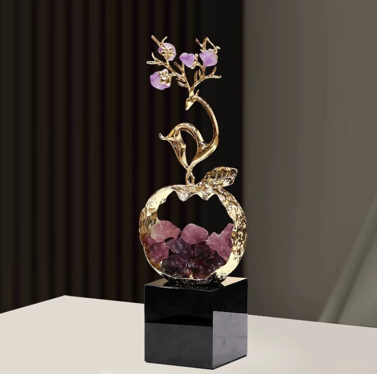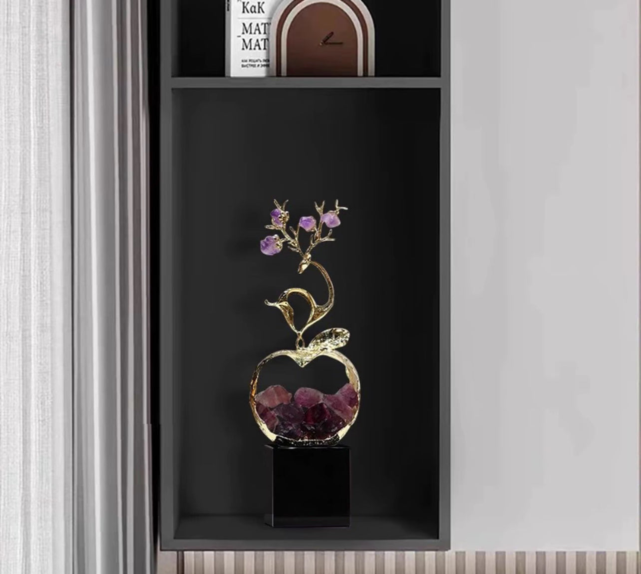 Golden Orchard Bloom is a striking piece of metal art that celebrates nature’s eternal elegance. Sculpted in radiant gold-toned alloy, the artwork features a stylized tree of life growing from an open apple-shaped frame, its branches adorned with delicate purple flowers and glittering crystals. The base of the fruit cradles raw amethyst clusters—each piece naturally unique—symbolizing wisdom, inner peace, and abundance.