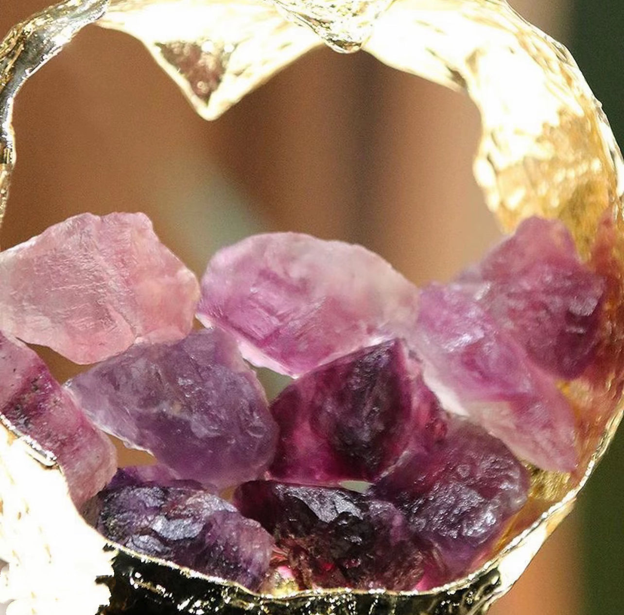 This handcrafted sculpture rests on a glossy black pedestal, creating a bold contrast that enhances its luxurious presence. A fusion of modern metal artistry and natural mineral beauty, it is ideal as a feng shui prosperity charm, desktop centerpiece, or a gift that speaks of growth and grace.