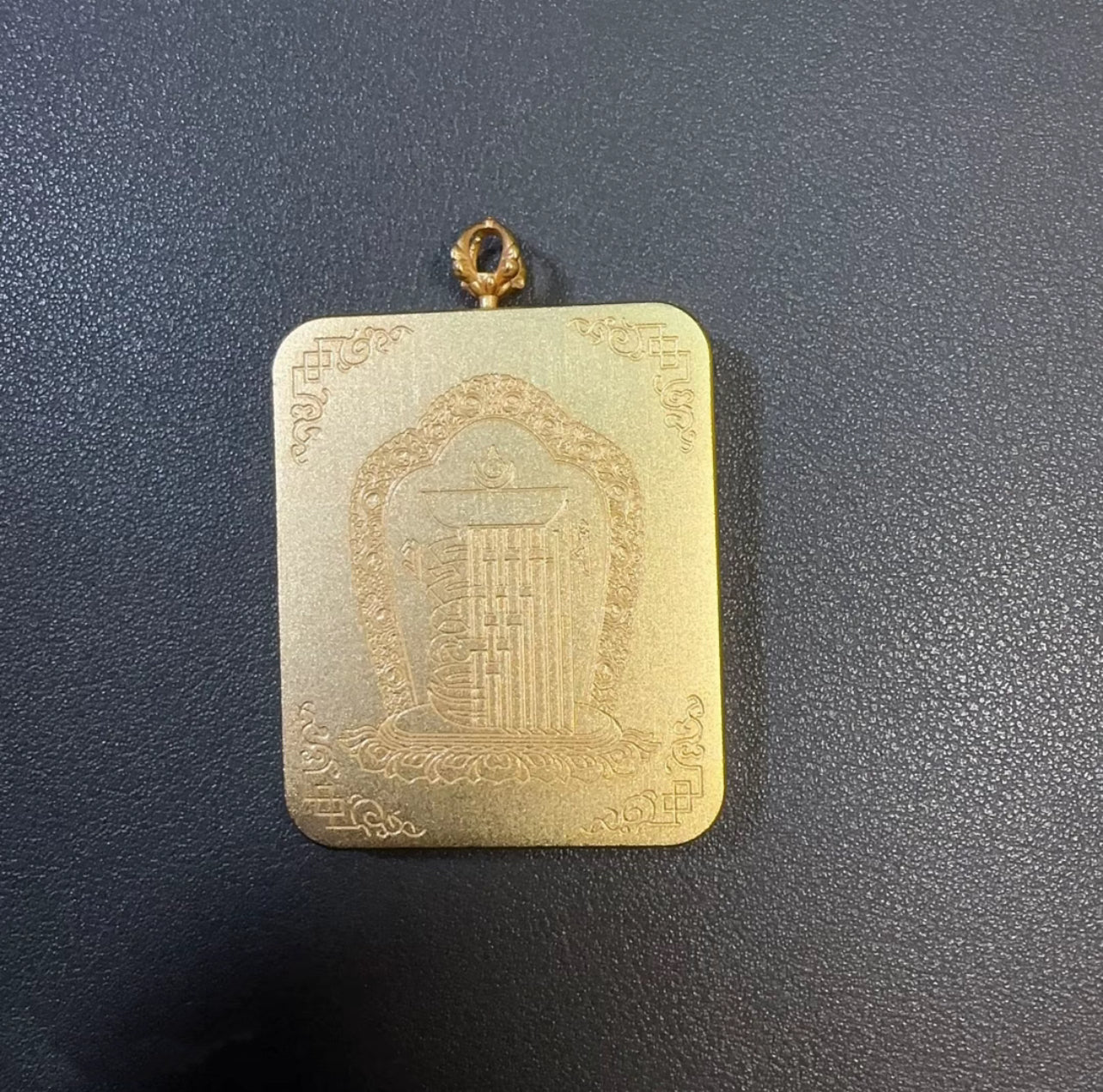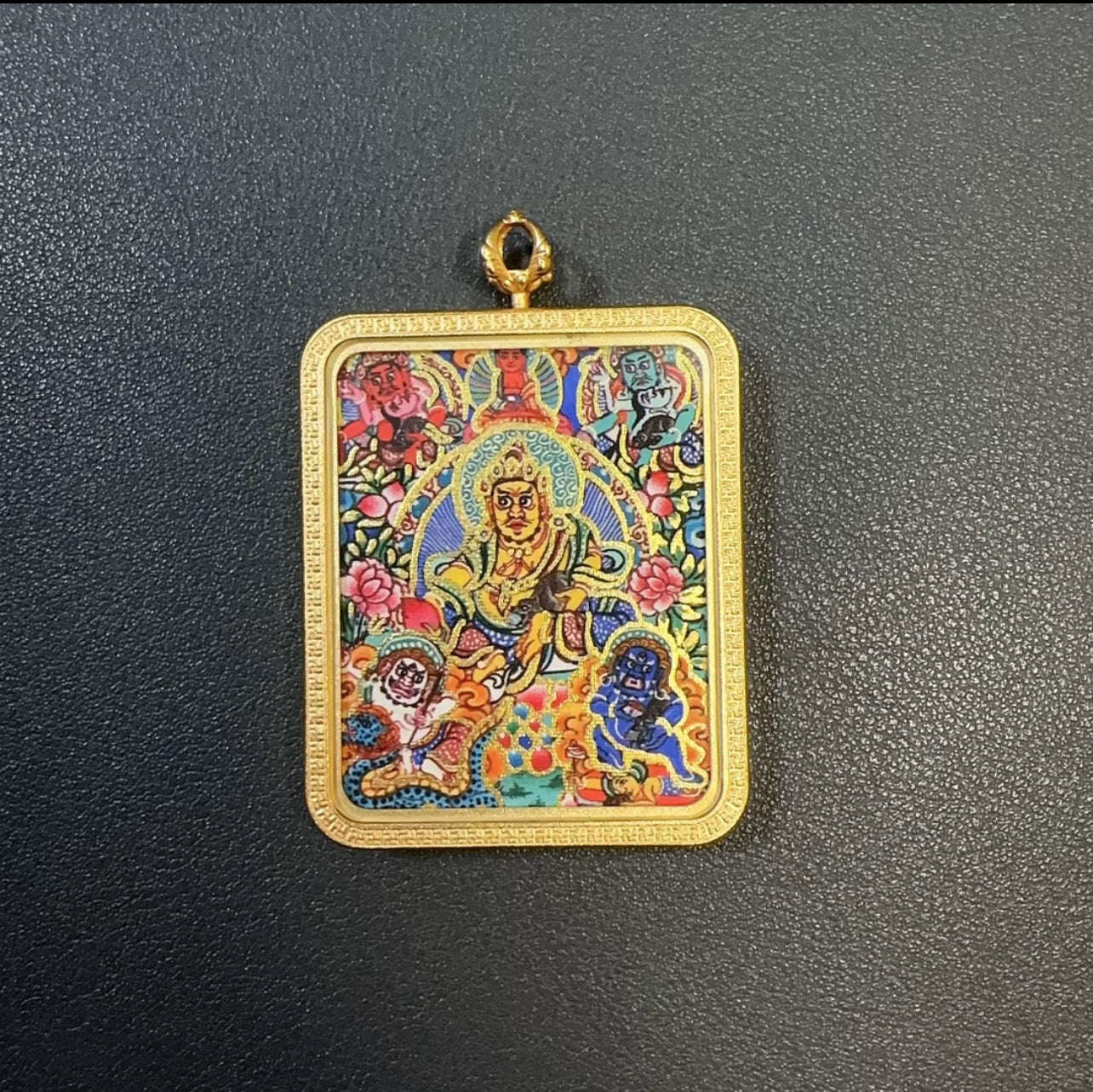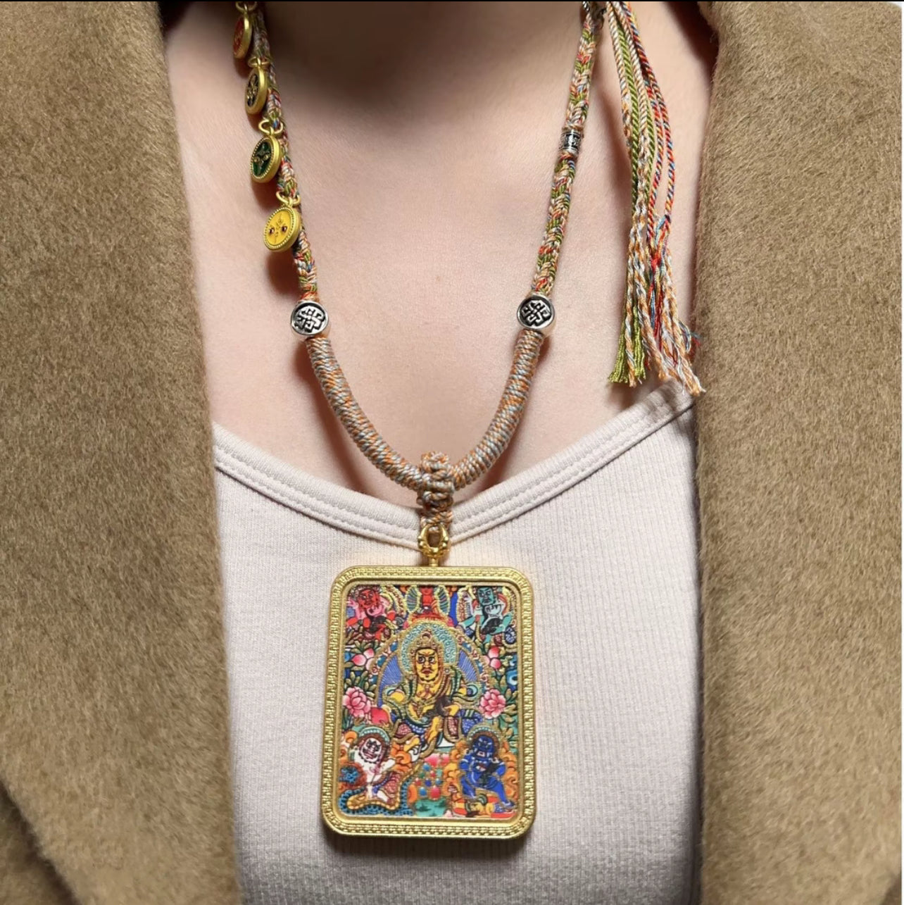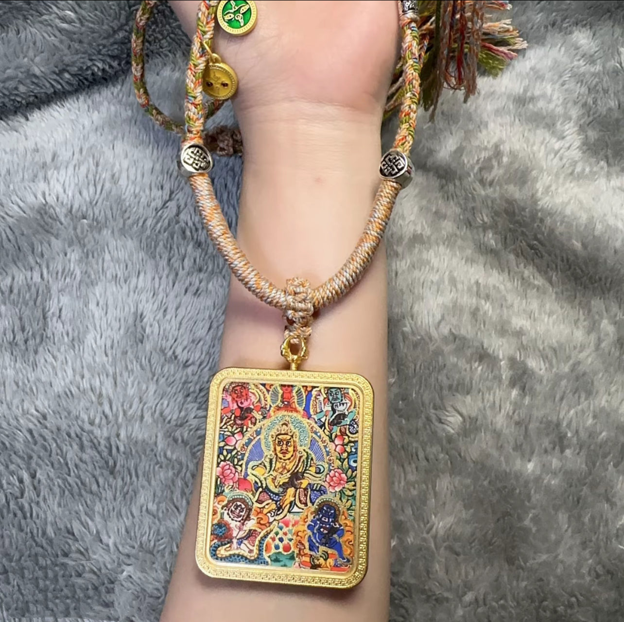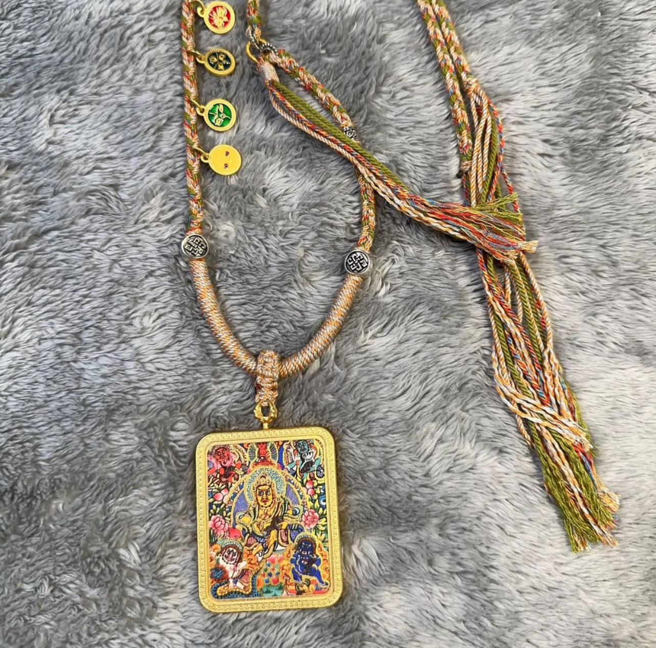 This radiant tangka pendant portrays a golden deity seated in serene power, encircled by blooming lotuses and vibrant guardian spirits. Embodying divine authority, compassion, and watchfulness, the central figure radiates an aura of spiritual sovereignty while fiery protectors stand sentinel below. Each detail — from the intricate gold frame to the harmonious interplay of sacred colors — reflects a balance of strength and beauty. This piece serves as a personal shield of light and an amulet of awakened presence, offering the wearer inner courage, spiritual alignment, and energetic protection in daily life.