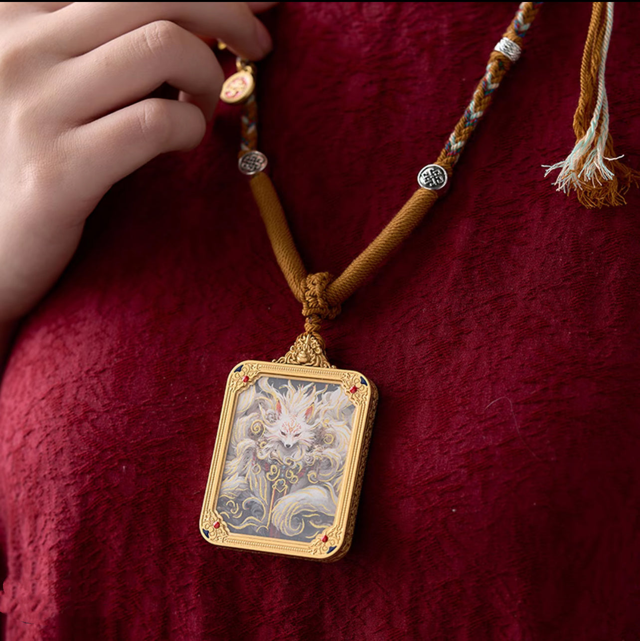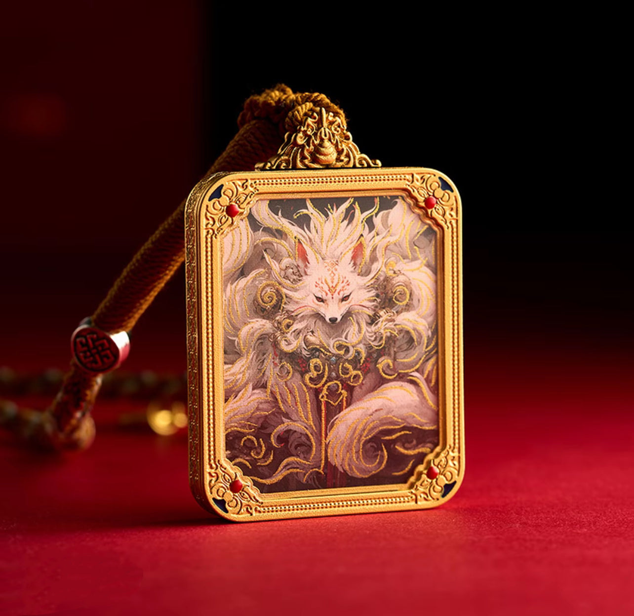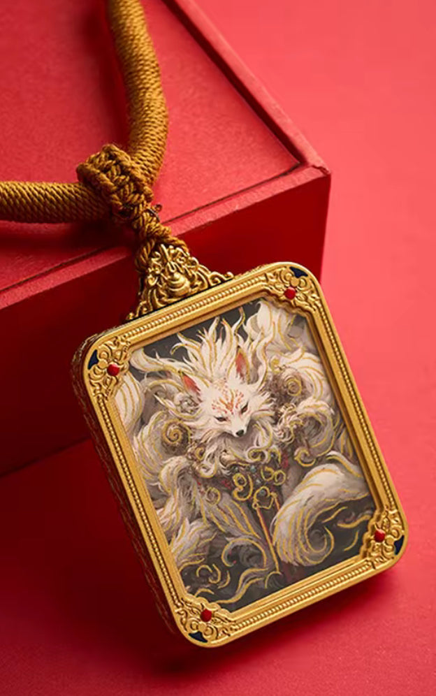 This intricate tangka pendant captures the mythical essence of the Celestial Fox Spirit, a revered creature of East Asian legend known for its ethereal beauty, wisdom, and mystic power. With nine flowing tails rendered in shimmering gold and ivory tones, the fox emerges from swirling clouds, eyes ablaze with timeless knowledge and quiet authority.