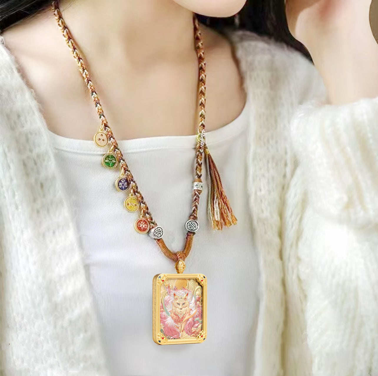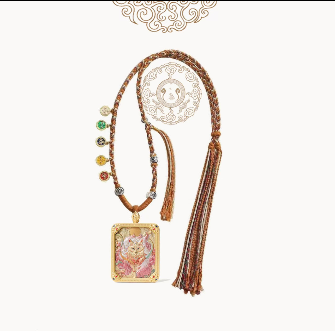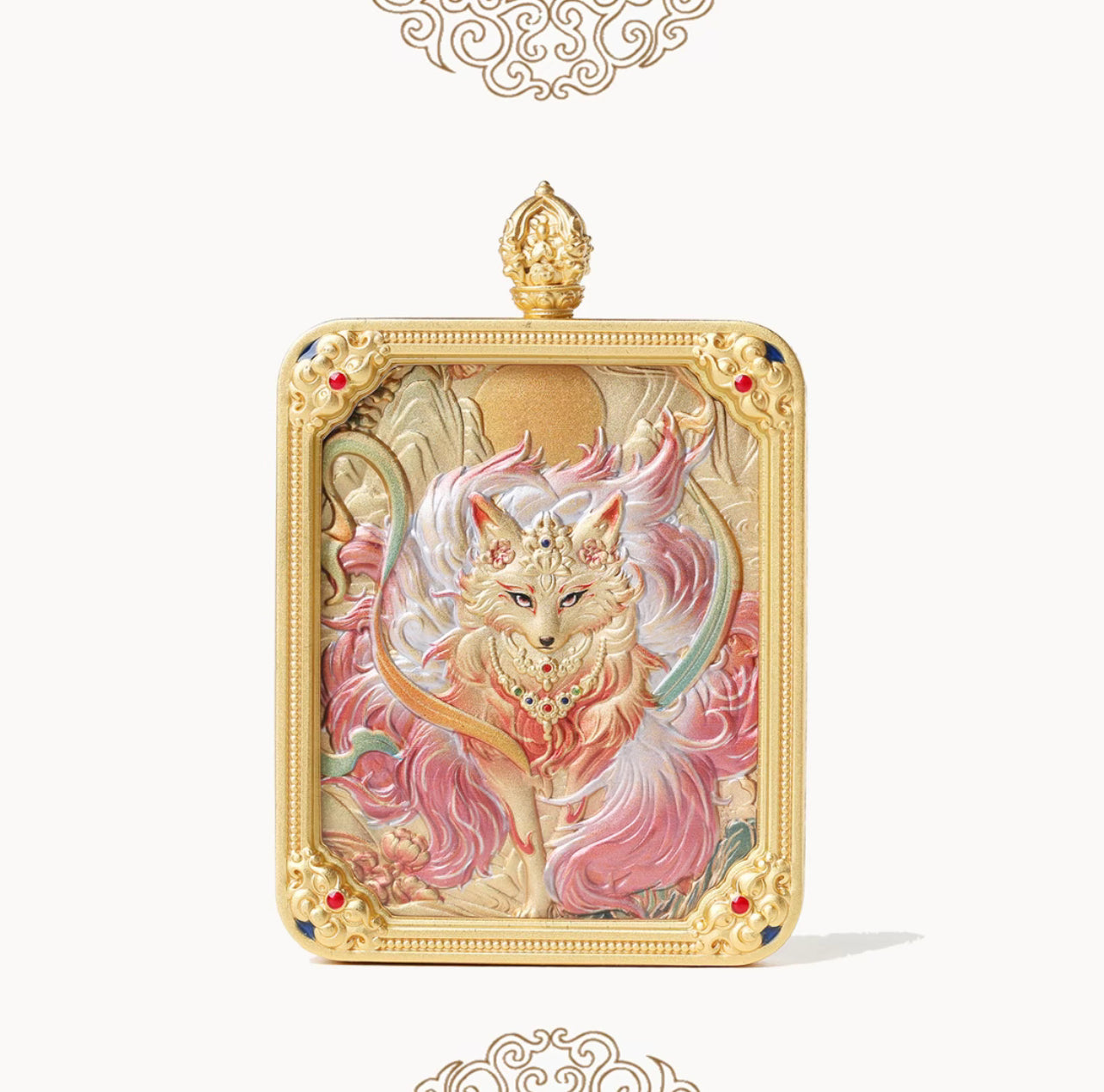 A majestic embodiment of mysticism and protection, this pendant features a celestial fox deity engulfed in swirling, flame-like fur — radiating strength, wisdom, and spiritual clarity. Rendered in soft rose golds and ivory whites, the divine creature is crowned with an ornate frame, symbolizing royal guardianship and cosmic harmony. Known in East Asian mythology as the Nine-Tailed Fox (Kitsune or Huli Jing), it represents transformation, feminine energy, and divine protection.