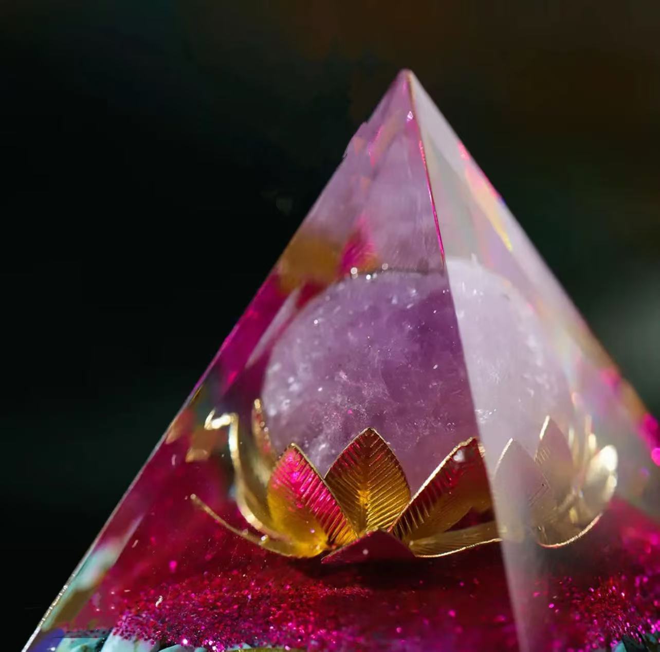 Unveil the mystique of the Lotus of Light Pyramid — a handcrafted orgonite sculpture featuring a radiant amethyst sphere cradled within a golden lotus, all encased in layers of shimmering pink resin. Designed for both energetic protection and aesthetic beauty, this pyramid channels the calming energy of amethyst and the divine symbolism of the lotus to inspire inner peace, spiritual growth, and vibrant harmony in your space. Ideal for meditation corners, workspaces, or as a sacred centerpiece, it’s more than decor — it’s a portal to stillness and self-illumination.