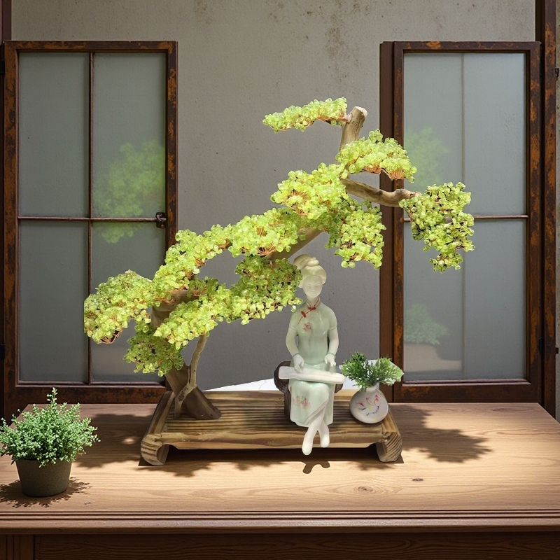 This graceful arrangement features shimmering green peridot crystal leaves delicately wired to a natural wood-like trunk, flowing in a sweeping bonsai silhouette. Nestled beneath the tree, a serene porcelain lady figurine sits in quiet elegance, creating a timeless tableau of peace and inner balance.