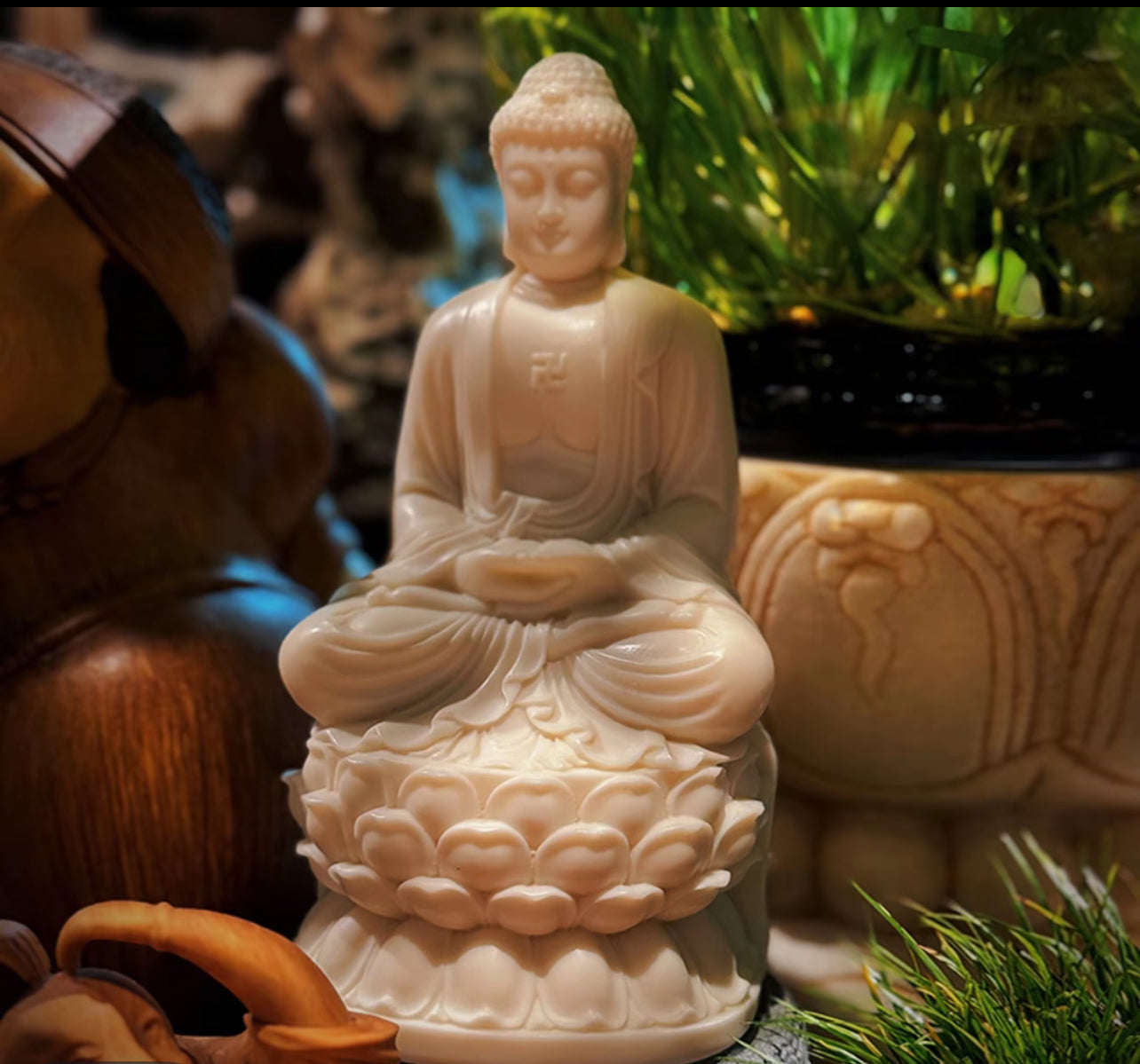 Gracefully seated upon a blooming lotus, this serene Buddha sculpture radiates inner peace and spiritual clarity. Crafted with a smooth, ivory-toned finish, every fold of the robe and every curve of the lotus petals reflects precision and calm craftsmanship.