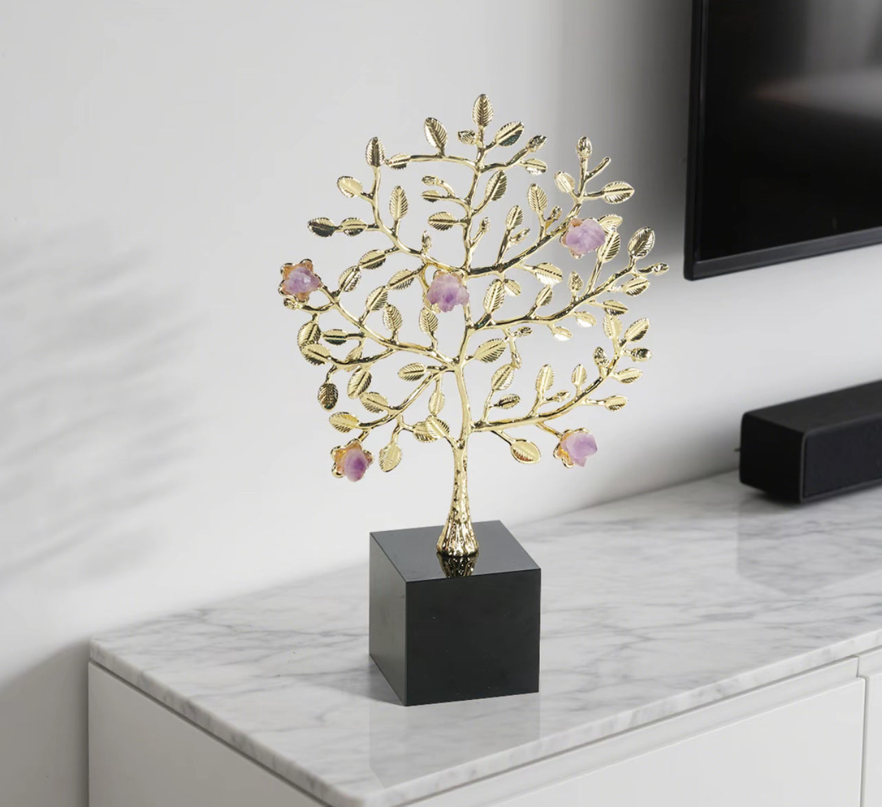 A striking symbol of harmony and growth, the Tree of Serenity is a handcrafted metal sculpture adorned with delicate amethyst blossoms. Each branch spreads with graceful balance, while the golden leaves shimmer under ambient lighting, making it a perfect centerpiece for any sophisticated interior. Rooted on a solid black base, this tree evokes strength, elegance, and a sense of peaceful abundance — ideal for home, office, or gallery décor. Let it remind you daily of nature’s quiet strength and blossoming beauty.